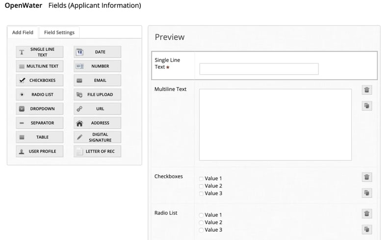 Once you’re in the form builder, you’ll have options to create and modify the fields your presenters will need to fill out as they complete their proposals. There are sixteen kinds of fields supported in OpenWater, each with a robust range of customizable options. You can see them illustrated below: