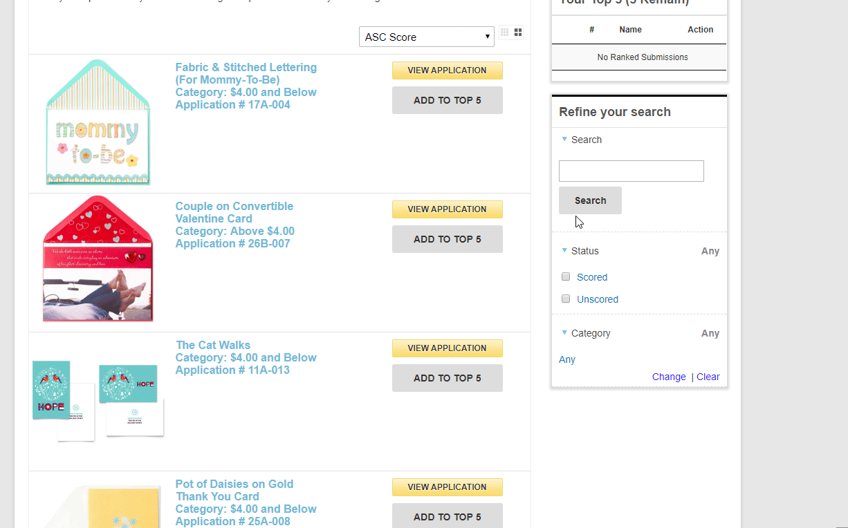 An alternative judging approach is Ranking. This is where you choose your favorite submissions, or set the order of submissions from favorite to least favorite. This is only recommended in a multi-round review process and would be recommended in a Finalist round where everyone already went through a rubric style review and then narrowed down to 3 to 5 finalists per category. In that scenario, a ranking would be an effective closer.