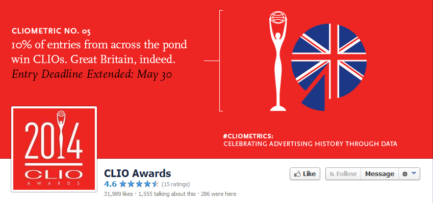 The CLIO Awards really nailed the concept of simplicity and incorporation of text. Using the red background is a pop of color that allows their profile picture to blend in with the cover photo, allowing the eye to focus on the stat. The statistic is short and pithy and is supported with a cool, patriotic pie graph. I love that they include a specific hashtag and use a term like “Cliometric.” The fact that the graphics are on the right side of the page with the text above the profile picture allows for a nice flow that lets the eyes explore the whole image without getting caught up on one side or the other.